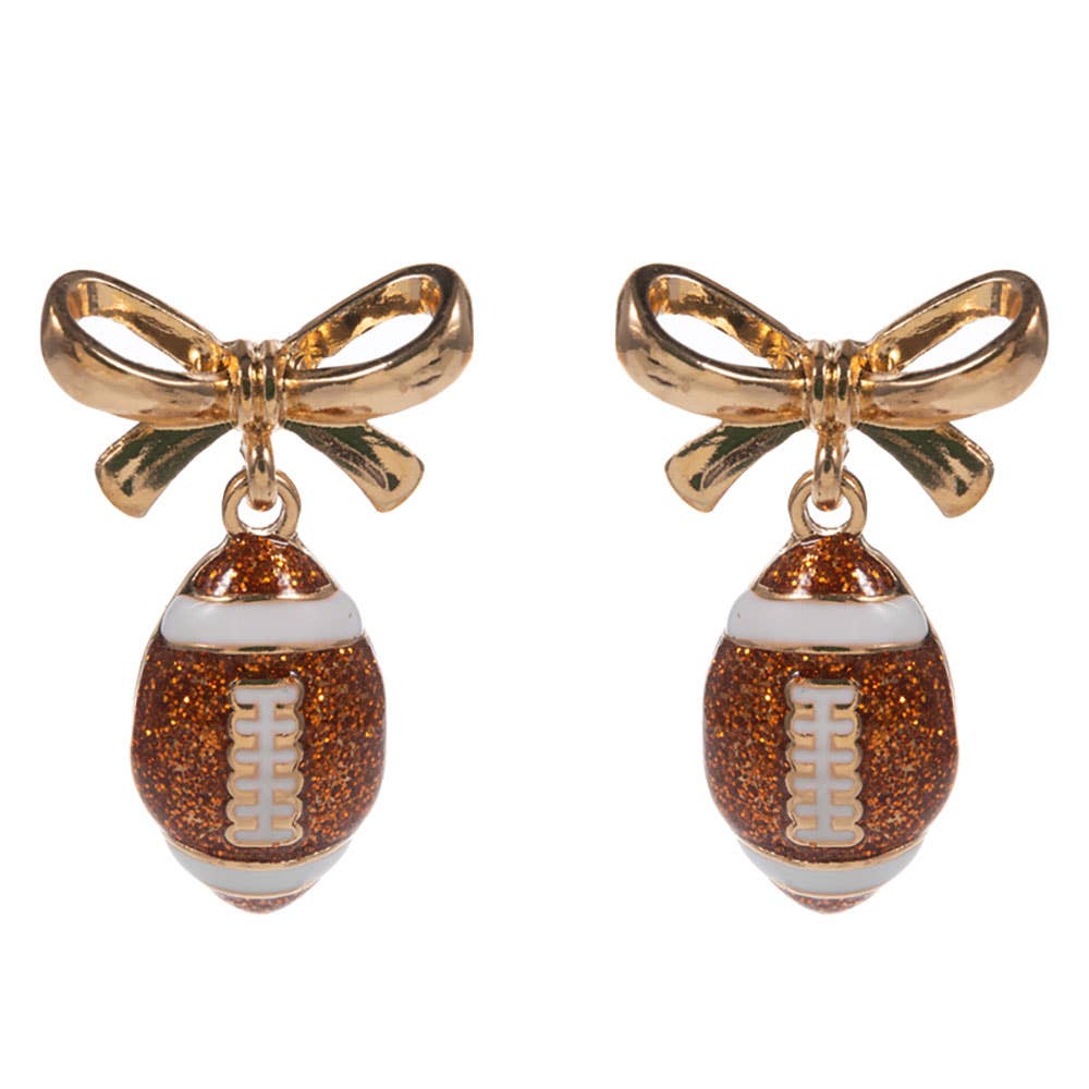 Add playful charm to your game-day outfit with these glitter football drop earrings. Featuring a cute bow detail, they’re perfect for tailgates, sports events, or showing team spirit in a fun and stylish way.