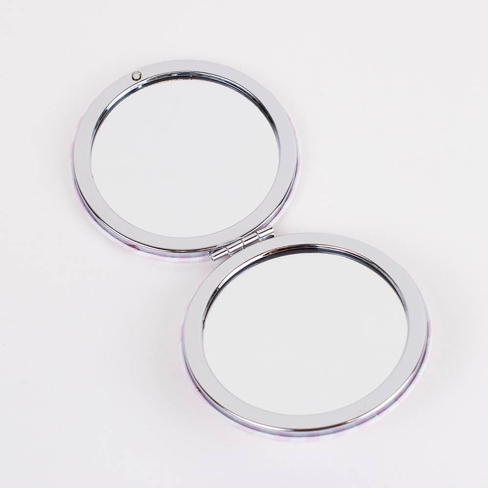This classic stripe pocket mirror in white and light pink is the perfect accessory for on-the-go touch-ups. Measuring at 2.75 inches, it fits easily in any purse or pocket. Search Keywords: