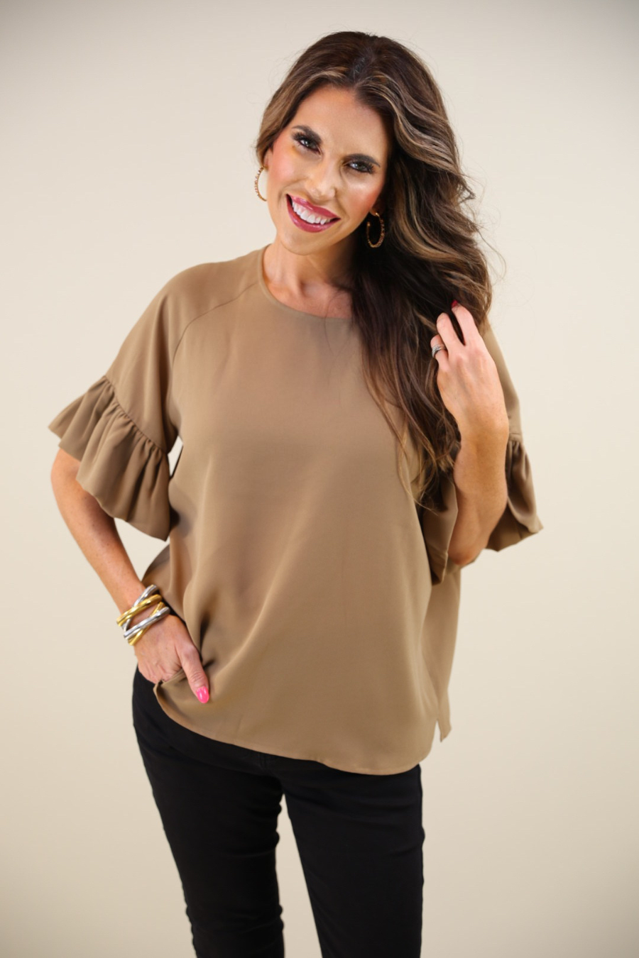 Elevate your wardrobe with our Rebecca Ruffle Sleeve Top. This classic top features charming ruffle sleeves that add a touch of feminine flair. Dress it up or down for any occasion with ease. Perfect for adding a stylish touch to any outfit.