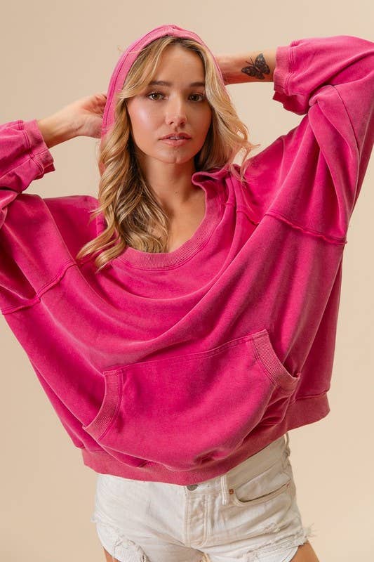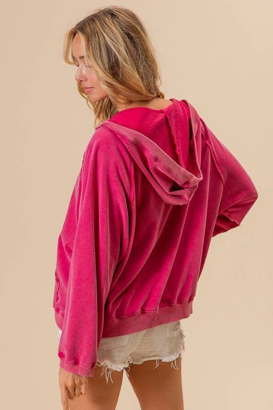 Washed French Terry Cut Edge Detail Hoodie Top With Kangaroo Pocket